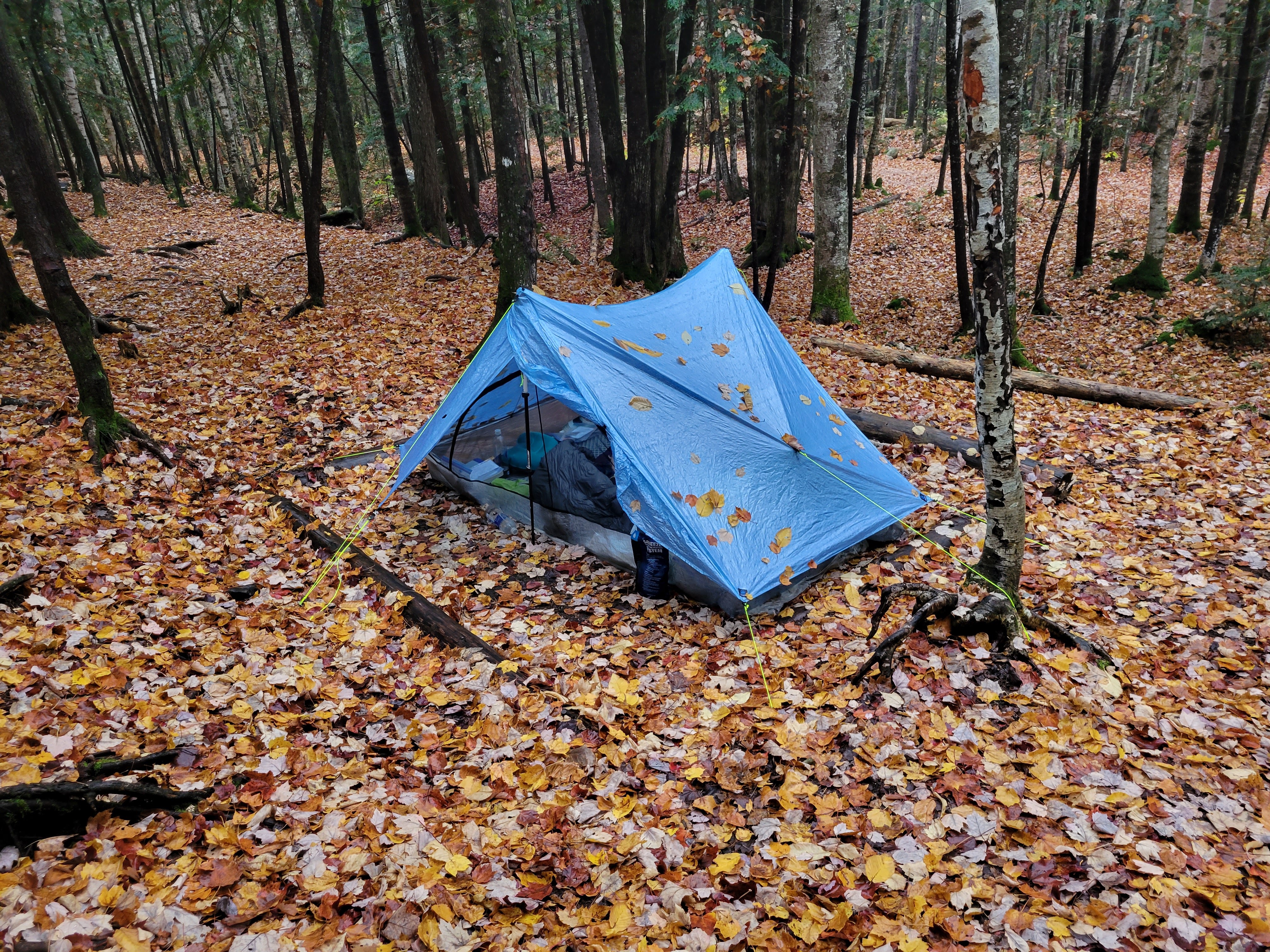 For our first time setting up the Duplex, it kept the night’s wet off us admirably well. Since it’s not a free-standing tent, it required a little more skill to set up properly than our last tent, and we hadn’t done a perfect job. In our ignorance, we’d set it up such that a small amount of water could seep from the outside of the tent to the corners of the bathtub floor across the the mesh that connected the two parts. Additionally, we’d shoved all our gear down against the bottom edge of the tent, creating yet more opportunity to water to flow across the mesh and into our home. Still, despite our best efforts, no more water got inside than could be absorbed by a bandana in each corner, and we were able to spend the night relaxed, reading and listening to the patter of rainfall around us.
