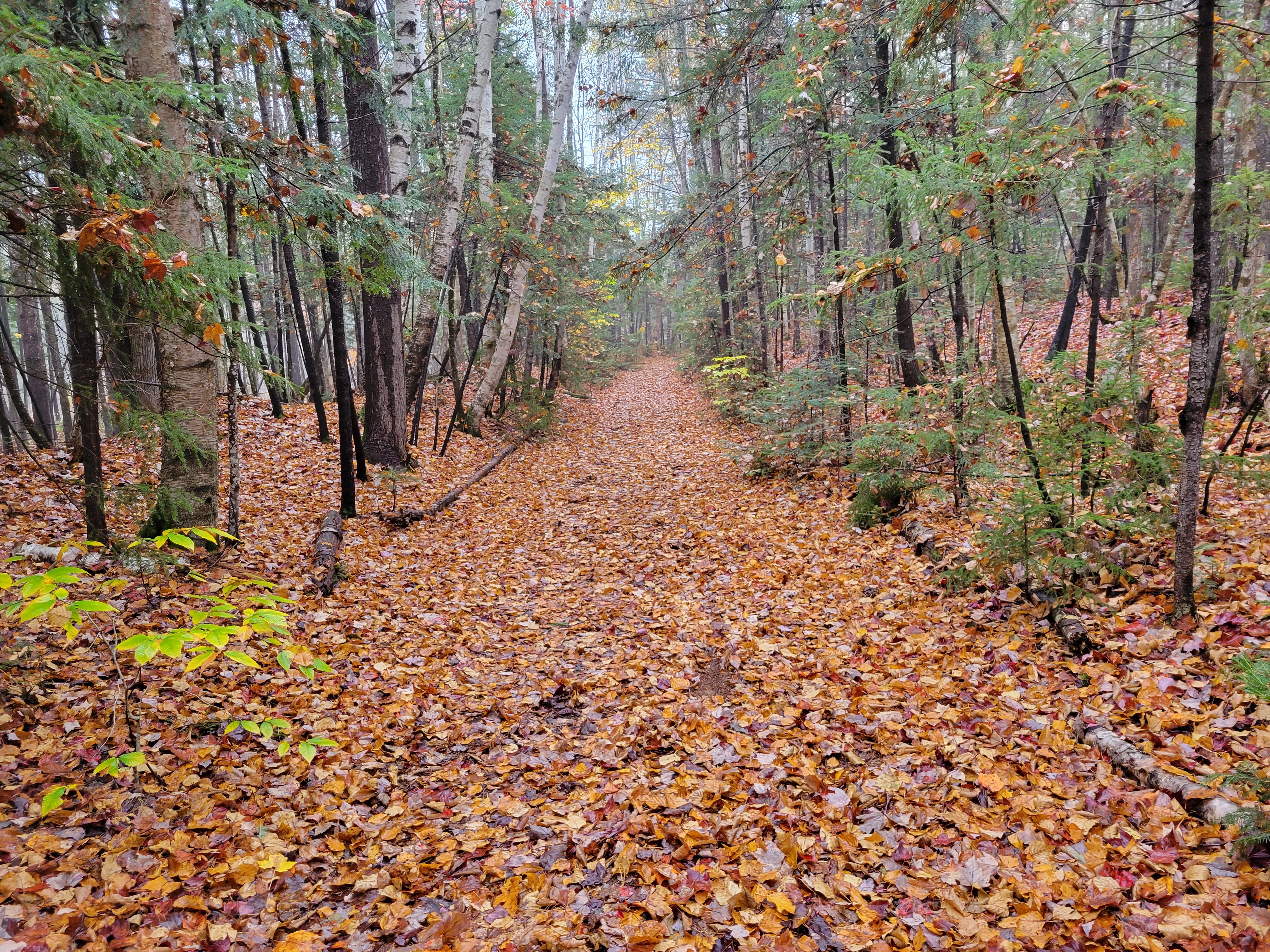 Heading north from the suspension bridge, the trail paralleled the river all the way to camp, crossing a few creeks along the way. Occasionally skirting the edge of the river’s embankment continued to provide larger scenic views while the foliage along the trail displayed endless variation of greens, reds, and yellows. Maria paused repeatedly along the way to take pictures of especially noteworthy colors.