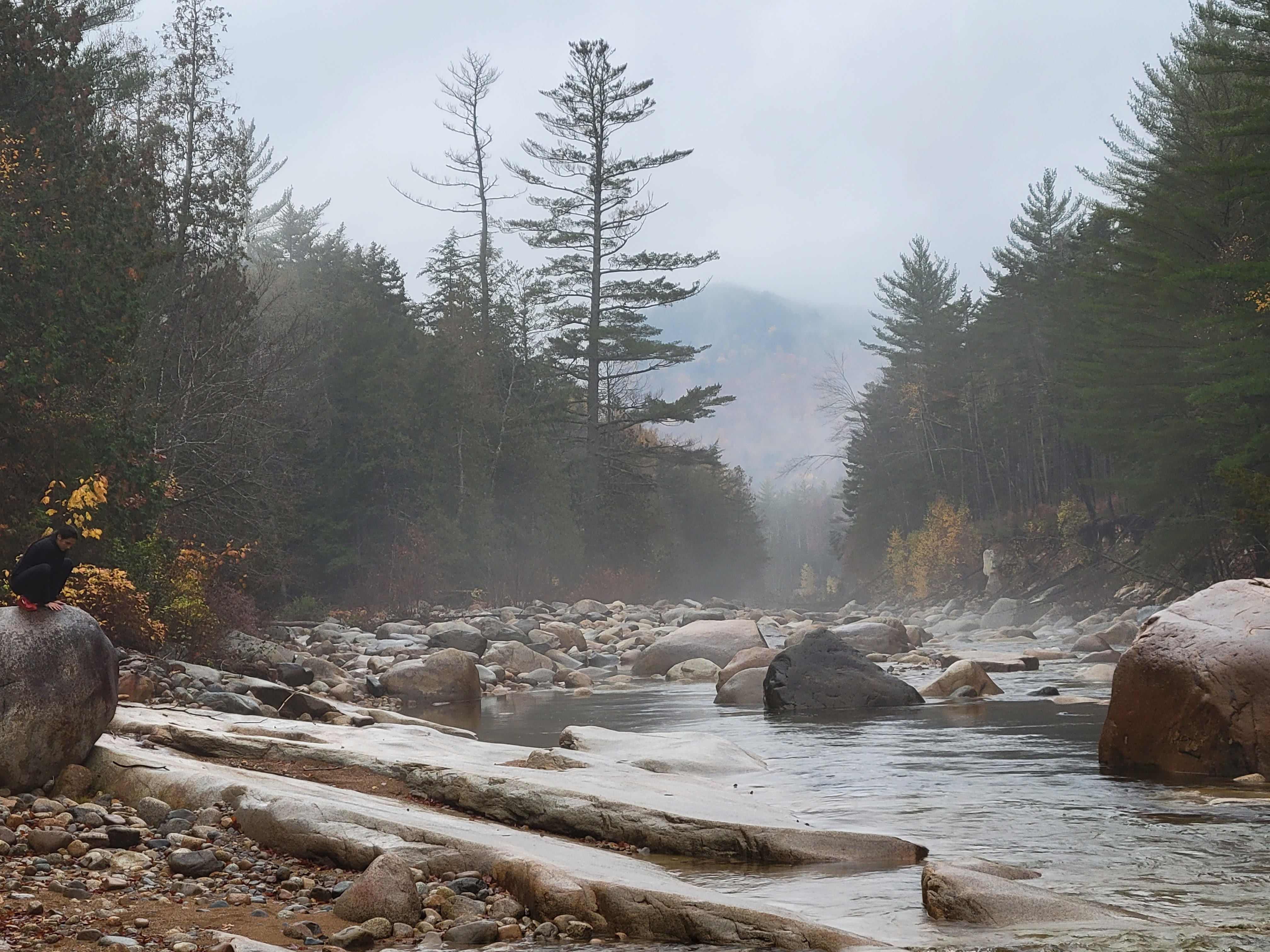 I actually managed to get all of my gear packed ahead of time for this trip (amazing, I know), so I was ready to go Friday on schedule. We would later discover, to both our great sorrow, that I had forgotten Maria trekking poles. She had some work meetings in the morning, so we didn’t start driving north until around 13:00. After a brief stop at the visitor center in Lincoln to grab a parking pass and ask for trip insights (none were significantly forthcoming), we decided to go to Lincoln Woods to play with the new tent. We made it to the Lincoln Woods trailhead around 16:30.